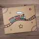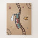 A puzzle featuring an illustration of a smiling wooden train chugging along a winding track. The background is a warm, gradient textured beige with subtle details like wooden gears and hand-drawn stars. A nice gift for a kid!