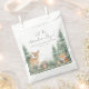 "Let the Adventure Begin!" with this sweet woodland-themed baby shower napkin. The design features a soft watercolor scene with forest animals — a deer, fox, raccoon, mouse, and hedgehog — gathered in a peaceful meadow surrounded by tall pine trees.