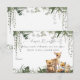 The gender neutral baby shower design with cute adorable woodland baby animals features a gender neutral colour palette with soft and soothing tones. The background showcases a watercolor painting of a lush green forest, filled with enchanting vibrant foliage and delicate greenery.