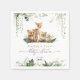 The gender neutral baby shower design with cute adorable woodland baby animals features a gender neutral colour palette with soft and soothing tones. The background showcases a watercolor painting of a lush green forest, filled with enchanting vibrant foliage and delicate greenery.