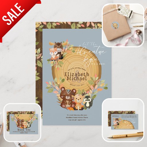 Budget - Let the Adventure begin with this adorable 'it's a boy' woodland animals themed baby shower, gender reveal invitation in dusty blue and rustic wood.
