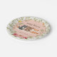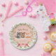 Woodland animals baby shower paper plates for girl featuring hand-drawn watercolor illustrations of cute forest creatures, like raccoon, bear and fox, on pink background and framed by floral wreath, on simple greenery background pattern. Easily personalize with your own text today.