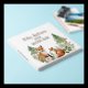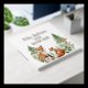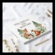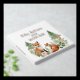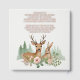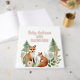 Soft Watercolor Design for a Whimsical Celebration Featuring a Deer, Rabbit and Fox amongst a woodland fir tree background.
