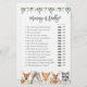 Woodland animals themed baby shower mummy or daddy game card features a watercolor woodland animals illustration and watercolor greenery eucalyptus garland and elegant handwritten style font.