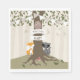 Baby shower napkins featuring an illustration of a tree with green leaves and exposed roots. A fox and racoon sit at either side of the trunk and an owl sits on banner wrapped around trunk that says, "Welcome Baby." Bunting is white.
