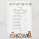 Woodland animals themed baby shower what is mummy wearing game card features a watercolor woodland animals illustration and watercolor greenery eucalyptus garland and elegant handwritten style font.