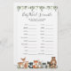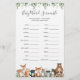 Woodland animals themed baby shower word scramble game card features a watercolor woodland animals illustration and watercolor greenery eucalyptus garland and elegant handwritten style font.