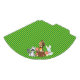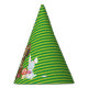 This party hat features a trio of woodland animals sitting on and around a tree stump and red and white mushrooms. A grey and black racoon sits to the left of the stump, a brown and tan squirrel holding an acorn sits on top of the tree stump, and a blue-ish grey bunny rabbit holding pink and purple flowers sits to the right of the tree stump. The background of the hat features a repeating pattern of two-tone green stripes. Click "Customise It" to add text or to change the design.