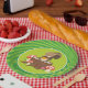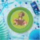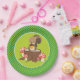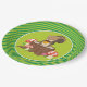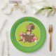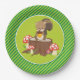 This birthday party plate features a cute clipart brown and tan squirrel sitting on a tree stump surrounded by three red and white mushrooms. The background of the plate is green in the centre with coordinating two-tone green stripes on the rim of the party plate.