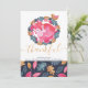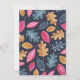 This delightful holiday card features a sleeping pink fox inside of a woodland leaf and acorn wreath, with a small bird near by - with a lovely delicate scroll font detail in gold colour with the word "joyful" - and a blue, pink, green and gold leaf pattern to the front and back