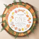 This cute 1st/first birthday circle invitation features a white background with a wreath of woodland animals which are a fox, bunny, and squirrel, autumn/fall leaves, mushrooms and acorn. The reverse side features an orange brown background with autumn foliage patterns. Personalise it for your needs. You can find matching products at my store.
