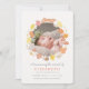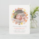 This cute photo birth announcement features a cream white background with a wreath of woodland animals which are a fox, bunny, and squirrel, autumn/fall leaves, mushrooms and acorn. The reverse side features a light beige background with autumn foliage patterns. Personalise it for your needs. You can find matching products at my store.