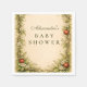 This charming baby shower design features an illustrated woodland storybook frame with twisting branches, delicate blossoms, soft greenery, and a whimsical red apple accent set against a warm parchment background. The vintage-inspired artwork and gentle earthy tones create a cozy, magical aesthetic that feels timeless and inviting, perfect for a storybook-themed celebration with a natural, fairytale-like charm.