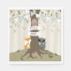 Baby shower napkins featuring an illustration of a tree with green leaves and exposed roots. A fox and racoon sit at either side of the trunk and an owl sits on banner wrapped around trunk that says, "It's A Boy!" Bunting is white and blue.
