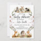 This invitation has cute woodland animals with white florals.