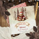 Cute little holiday bear in a santa suit, "It's A Boy and We Can" "Bearly Wait" script text Baby Shower or Sprinkle design with muted dusky red and mocha brown text. Design features a sweet baby bear nestled with his Christmas presents backed by a mocha and grey forest with bauble adorned trees and a watercolor brown and subtle green background. A watercolor greige banner for the script text sits below. The outer rim features a distressed dusky red and white check background. Composite design by Holiday Hearts Designs.