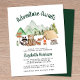 Budget-friendly rustic baby shower by mail invitation featuring a cute watercolor illustration of woodland animals camping with their tent and campfire in the mountains and forest and "Adventure Awaits" and the mother-to-be's name in a dark hunter green script.
