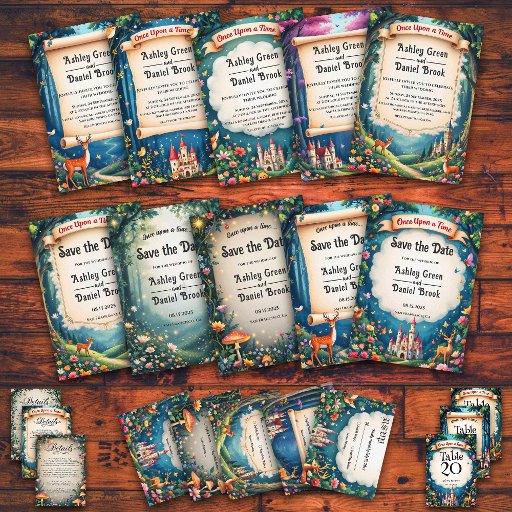 Step into a storybook romance with this enchanting fairytale-themed wedding all-in-one invitation. Featuring a whimsical woodland border of glowing florals and twinkling lights, with the charming phrase “Once upon a time…”—perfect for a fairytale celebration.