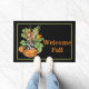 Welcome the Fall season with this whimsical watercolor illustrated woodland harvest elf / nymph perched on large pumpkins on black background with customisable orange text