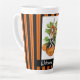Welcome the Fall season with this whimsical latte mug featuring a watercolor illustrated woodland harvest elf / nymph perched on large pumpkins with orange and black striped background and a customisable text strip at the bottom