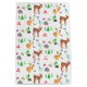 A woodland fawn standing by three little red mushrooms while a moth flutters by. All-over pattern on the back with a charming woodlands vibe with squirrels, fawn, mushrooms, moths, pine trees, and porcupines.
