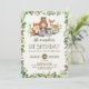 Whimsical 1st birthday invitation featuring illustration of rustic watercolor greens, foliages and adorable forest animals: fox, deer, bear and racoon