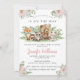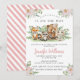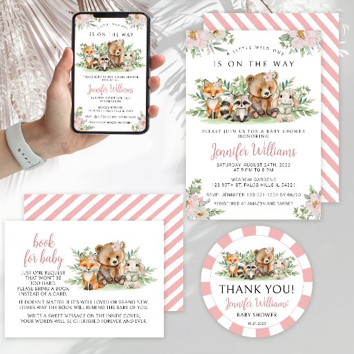 Watercolor cute pink floral Woodland forest animals baby girl shower invitation. A little wild one is on the way baby shower.