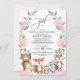 This super pretty woodland-themed baby shower invitation features adorable forest animals and soft pink floral greenery wreath. Use the design tools to edit the text, change font colour and style to create a unique one of a kind invitation design.