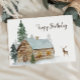 These Birthday cards are designed with a watercolor forest scene featuring a log cabin, pine trees, a deer and personalised text.