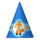Woodland Forest Fox Birthday Party Hats in Blue, Orange and Brown. Features an adorable orange fox on front and a simply sweet tribal inspired pattern going around. Part of our "Wild One" 1st Birthday Collection.