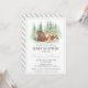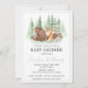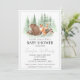 Watercolor woodland forest animals greenery, leaves baby shower invitation.