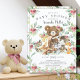 Cute baby shower design featuring the sweetest bear sitting on a tree stump surrounded by a deer, racoon, squirrel, fox, moose & fox. Framed with natural green watercolor leaves set on a white background. Flip our invite over to view a matching green leaf back for an extra special touch..