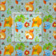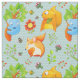 An original illustration that I first painted in watercolour and then digitally enriched, of delightful woodland critters — a cute blue bear up a tree, a sweet squirrel holding an acorn and a fun curled-up fox, amongst mushrooms, a flower and branches, and set against a background of pale aqua zigzag stripes. A delightful woodland setting perfect for a kids room or for a child’s birthday party, boy or girl.