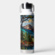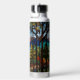 A radiant stained glass scene of a majestic forest sanctuary, where towering trees frame a stunning mountain range in the distance. Light and color intertwine to create a serene yet powerful tribute to the wild.