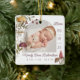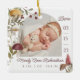 New baby birth stats photo Christmas ornament. The design features two photos, one photo on the front and one on the back. Display your new baby's photo. The date of birth is displayed along the side and the baby's name and birth stats along the bottom. Our whimsical and charming design is bursting with our hand-painted watercolor mushrooms, winter greenery, and berries. Watercolor painted by Moodthology.