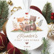 This cute baby's first Christmas ornament features woodland animals, including a fox, bunny rabbit, owl, and bear. The ornament can be easily personalised with the baby's name, date, and photo. The design is simple and whimsical, with the woodland animals arranged around a tree log. The ornament is perfect for celebrating the baby's first Christmas and will be a cherished keepsake for years to come.