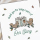 Express your gratitude with our Woodland Storybook Baby Shower Thank You Card. Featuring a sweet illustration of squirrels with a storybook nestled amidst the leaves, this card exudes a cosy, cottage core charm with a touch of autumnal magic. The original artwork captures the essence of a forest story, perfectly complemented by a prewritten message of thanks that aligns with the whimsical storybook theme. The back of the card boasts a delicate pattern of falling leaves, enhancing its fall-inspired allure. Personalise with your own message of thanks and signatures for a truly one of a kind thank you note! This card can also be effortlessly downloaded, ensuring your gratitude is promptly shared with just a few clicks. Or download and print from home for quick and easy sending!