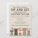 Invite your guests to your woodland themed sip and see with our adorable, rustic woodland invitations. Animals include a fox, moose, bear, racoon, and rabbit in brown and orange colour scheme with a burlap background.