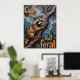 This detailed depiction shows a racoon with its characteristic markings, securely positioned on a branch of a bare tree. The background is a subtly textured blend of cool blues and warm earth tones, hinting at a forest landscape under an overcast sky. The phrase "CUTE BUT FERAL" is clearly presented in white, stylised letters at the bottom, providing context to the animal's appearance.