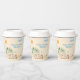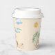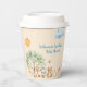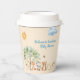Woodland wildlife baby shower paper cups feature a beautiful watercolor design with a fox, a sheep, a bear and a little duckling. They're gathered together under a beautiful tree and there are flowers all around them and sweet little bumble bees gathering nectar. A fluffy cloud is in the sky and the sun is shining down. Typography says "Welcome to NAME's Baby Shower" and you just fill in the name of the Mum to be with the easy to use template provided. Design appears on both sides of the cup. This version has a pale peach background.