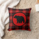 Pillow with red, black, and cream plaid with a black bear on one side and red with bear paw prints on the back. The red is changeable! Swap out the red for any colour you prefer.