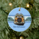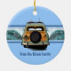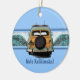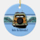 A vintage woody equipped with a pair of longboards, finds the perfect double breaking wave. The illustrated wave has a ghost image of a hibiscus pareau print. The vintage California license plate says Beachin'. For Christmas, our greeting is "Mele Kalikimaka", but these ornaments make great gifts year round, customise them with your own message! These designs comes several colorways.
