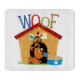 A cute dog with a ball and dish of food, a dog house, and colourful text that reads WOOF on Woof Dog T-shirts, hoodies, mugs, bags, cards, stickers, key chains, buttons, magnets, dry erase boards, electronic cases and sleeves, paper plates and napkins, and many other dog design items!