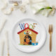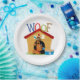 A cute dog with a ball and dish of food, a dog house, and colourful text that reads WOOF on Woof Dog T-shirts, hoodies, mugs, bags, cards, stickers, key chains, buttons, magnets, dry erase boards, electronic cases and sleeves, paper plates and napkins, and many other dog design items!