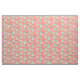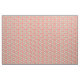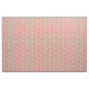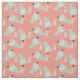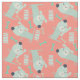 Fun, colourful, whimsical fabric great for dog lovers of all ages, features blue dogs, bones of clay and aqua, and text that reads Woof on a coral background.