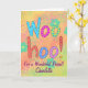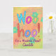 Woohoo - Tell someone how special their friendship is with this card. The words WooHoo are on a colourful orange and lime green ombre background. The customisable words For a Wonderful Friend and a personalised name are below the word text art. The sentiment words inside the card are also customisable to express you friendship. The art design background is textured and ombre colours with flowers and line art flowers. Colours: Turquoise teal blue orange lime green purple.
