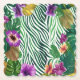 The picture shows a lively mosaic of lush Monstera leaves in lush green and yellow, combined with magnificent purple and orange flowers that stand out against a dynamic, wave-like background. It radiates a wild, tropical energy and a joyful abundance, which awakens curiosity and a natural connection.