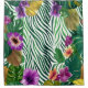 The picture shows a lively mosaic of lush Monstera leaves in lush green and yellow, combined with magnificent purple and orange flowers that stand out against a dynamic, wave-like background. It radiates a wild, tropical energy and a joyful abundance, which awakens curiosity and a natural connection.