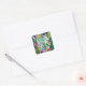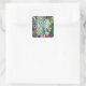 The picture shows a lively mosaic of lush Monstera leaves in lush green and yellow, combined with magnificent purple and orange flowers that stand out against a dynamic, wave-like background. It radiates a wild, tropical energy and a joyful abundance, which awakens curiosity and a natural connection.