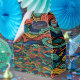 Is a vibrant and eye-catching one, featuring a colourful paisley pattern that gives the impression of being woven from numerous wool threads. The colour palette consists of four distinct and lively colours: yellow, turquoise, dark blue, and orange.